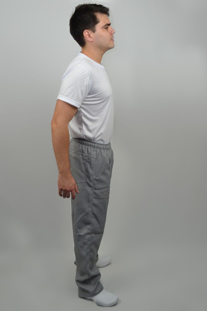 Calça em tecido Pied-Poule (xadrez) muito utilizada na gastronomia.