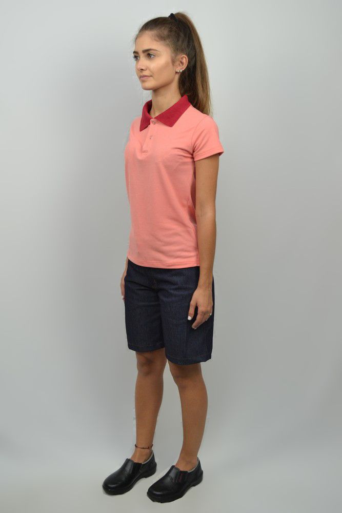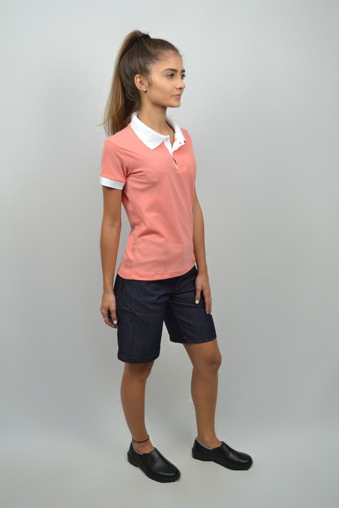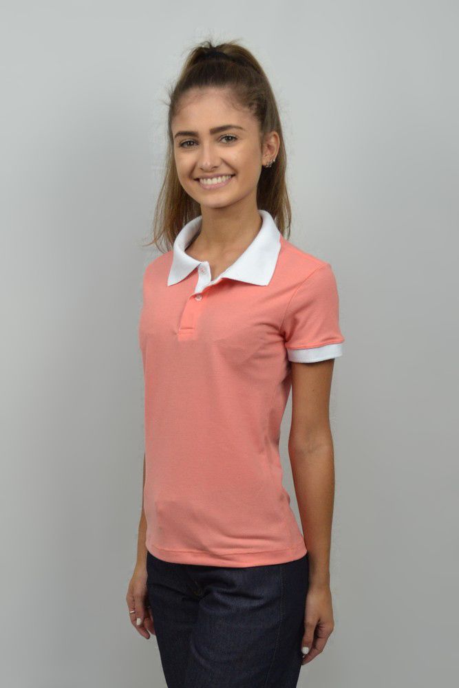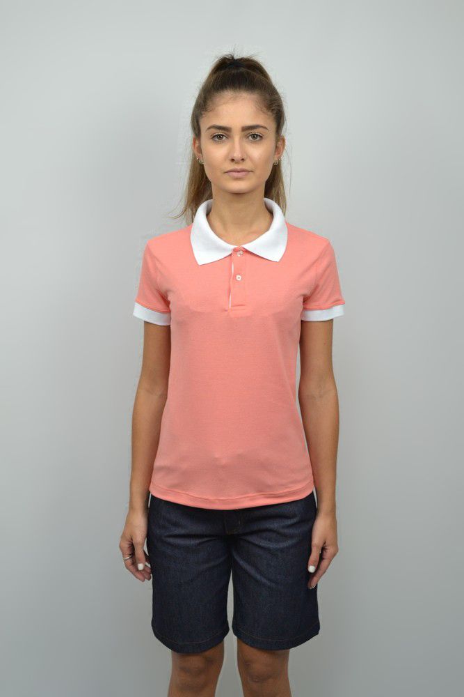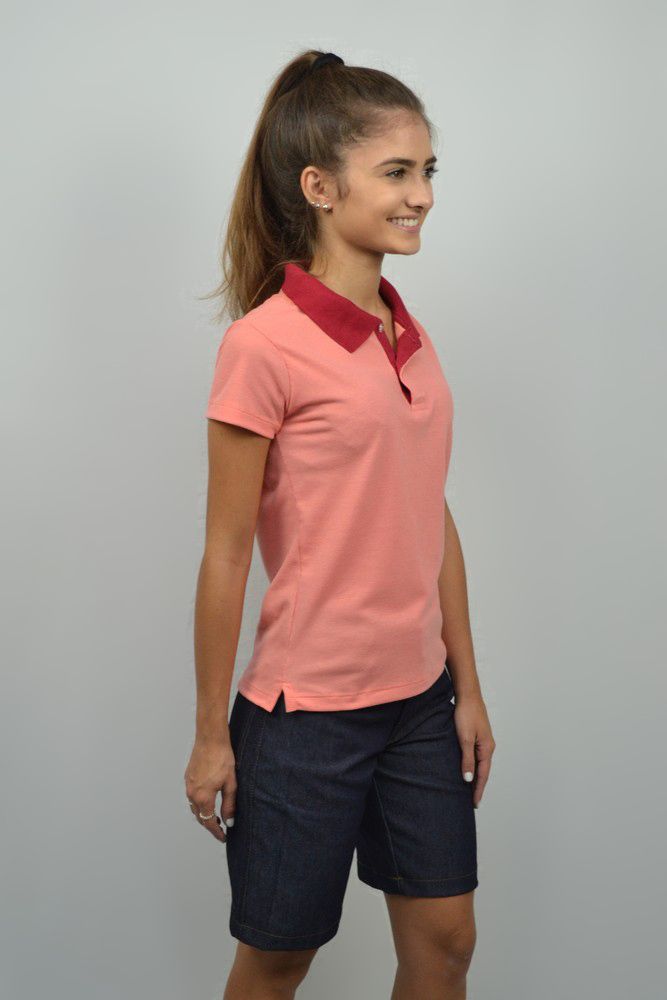 A Camiseta Polo Feminina oferece modelagem afeminada, com recortes delicados e acinturados, com acabamento fino valorizando a voluptuosidade corporal natural feminina.