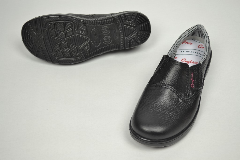 Sapato de segurança feminino confeccionado em couro vaqueta integral estampa relax, com elástico nas laterais. Possui palmilha interna removível em EVA com tratamento antimicróbios. Indicado para serviços